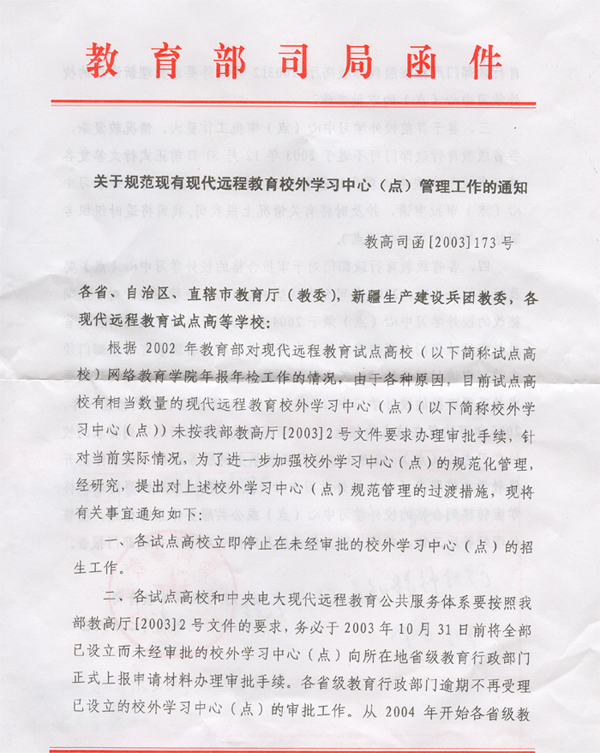为了执行教高司[2003]173号文件,请还未通过审批的校外学习中心(点)尽快按我院日前发出的紧急通知的要求,办理审批手续。