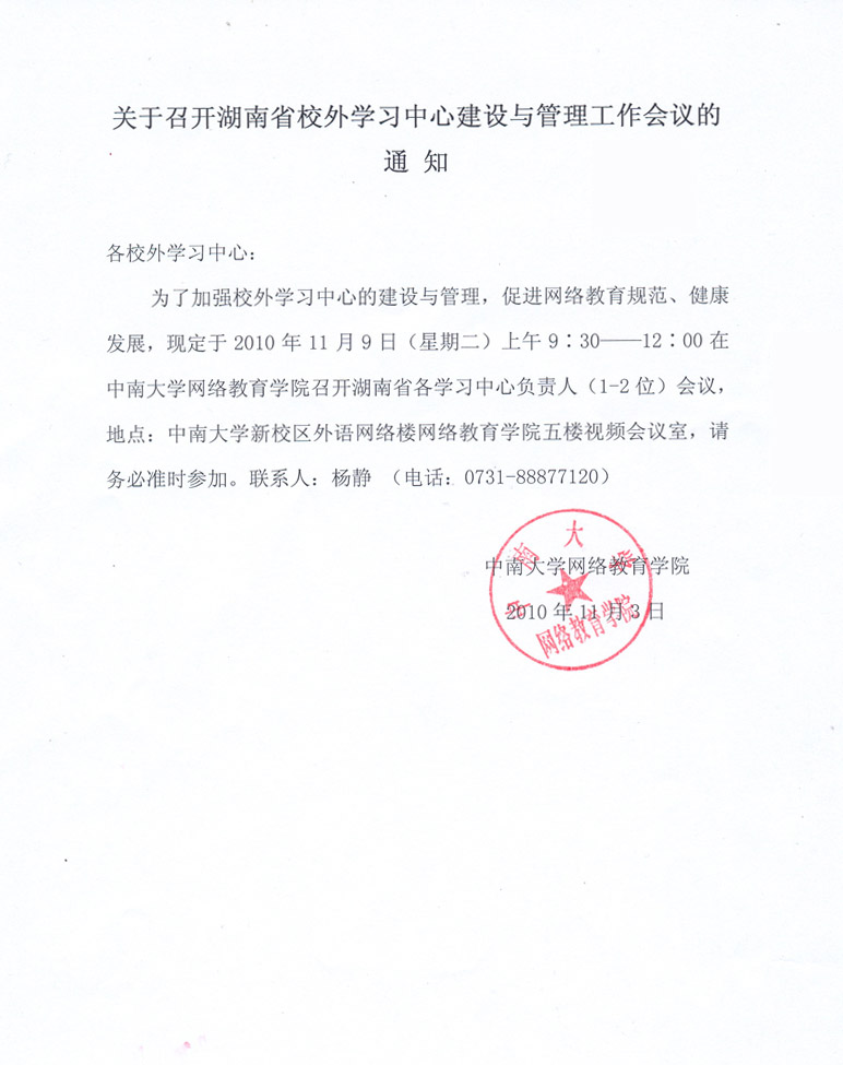 为了加强校外学习中心的建设与管理,促进网络教育规范、健康发展,现定于2010年11月9日(星期二)上午9∶30--12∶00在中南大学网络教育学院召开湖南省各学习中心负责人(1-2位)会议,地点:中南大学新校区外语网络楼网络教育学院五楼视频会议室,请务必准时参加。联系人:杨静 (电话:0731-88877120)