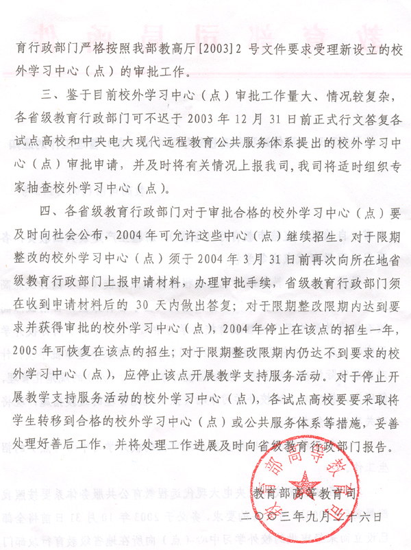 为了执行教高司[2003]173号文件,请还未通过审批的校外学习中心(点)尽快按我院日前发出的紧急通知的要求,办理审批手续。