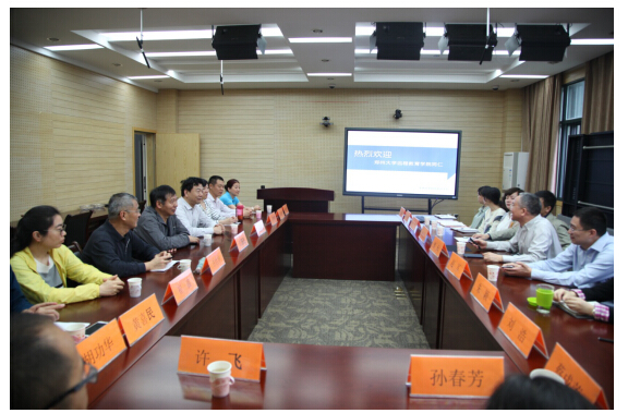 2016年5月19日下午,郑州大学远程教育学院郜国民书记、李占波院长、许世华副院长、候铁翠副院长及学院部门负责人一行十人来我院工作调研,学院廖耘院长、余社平副院长、赵军副院长及部门负责人在学院五楼会议室参加了接待与座谈。