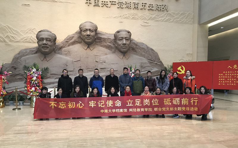 2017年12月17日,网络教育学院与档案馆联合党支部组织全体员工前往湖南党史陈列馆开展主题党日活动暨工会活动,旨在铭记历史、缅怀先辈,接受革命传统教育,进一步学习领会党的十九大精神。