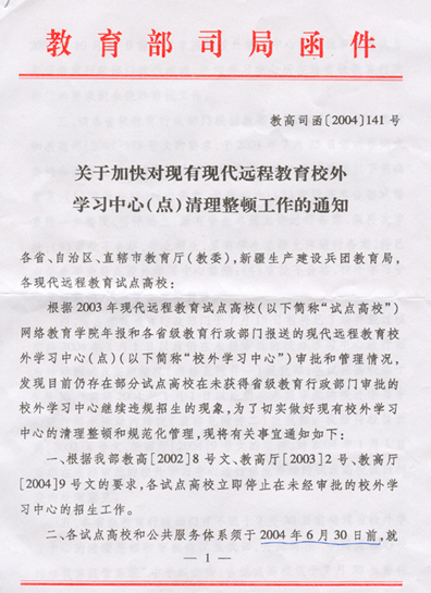 现把教高司函[2004]141号文件传给你们,请你们严格执行文件精神,根据文件要求对本管理中心的校外学习中心进行清理整顿并及时与当地省级行政部门进行协调沟通,同时将有关工作情况通报学校。