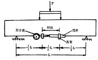 取出试件后,先静放置凉干表面(以利粘贴),再用铅笔或粉笔(削尖)准确画线。标距为受纯弯部分长度的4/5。大、中、小梁的纯受弯部分长度为15、l0、5cm,故相应的标距为12、8、4cm。 千分表架用502胶(或其它胶)粘贴。注意表架应与试件表面垂直,表架孔中心线应与梁底面在同一平面上,如图4—8所示,其变形值选用梁受弯时底面标距内所产生的最大变形。对材料粒径较大的大、中梁试件,表面往往凹凸不平,为利千粘贴,可用原材料填平,以保证粘结质量。