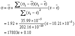 例一:用5×5×24cm的小梁以延度法(标距为4cm)测定石灰土的抗弯拉强度和抗弯拉回弹模量,所测数据如表4—9所列,计算该材料的抗弯拉强度和抗弯拉回弹模量。 解: ①按计算公式计算各级荷载作用下的应力和应变。 各级计算结果列入表4—9中。 ②计算抗弯拉强度S (0.5MPa) ③计算回弹模量 a.图解法 将所计算的和点在直角座标内,根据各点离散性。绘出σ一ε关系图线如图4—9所示。此算例所得结果大体趋向为一直线。 因此量取并算出直线的斜率就代表该试件材料的抗弯拉回弹模量。 本例得Ei = 18523kg/cm2 (1852.3MPa) 同法可求同组中的其余各试件模量值。 b.计算法 由上面图解知基本为直线关系。故按线性回归方程求解。 为计算方便,采用表格形式,并将计算结果列入表4—9各栏中,这样可得: