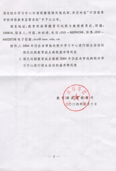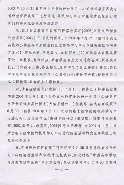 现把教高司函[2004]141号文件传给你们,请你们严格执行文件精神,根据文件要求对本管理中心的校外学习中心进行清理整顿并及时与当地省级行政部门进行协调沟通,同时将有关工作情况通报学校。