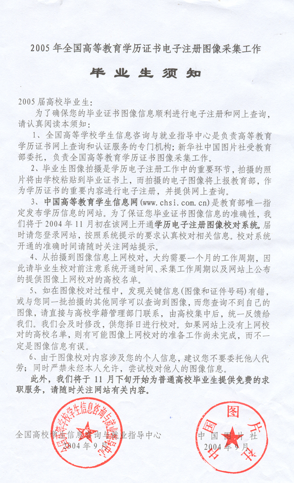 2005届高校毕业生电子注册图像采集工作已经开始,为了确保我校2003年春、2003年秋入学学生图像采集工作的顺利进行,现将有关注意事项说明如下: