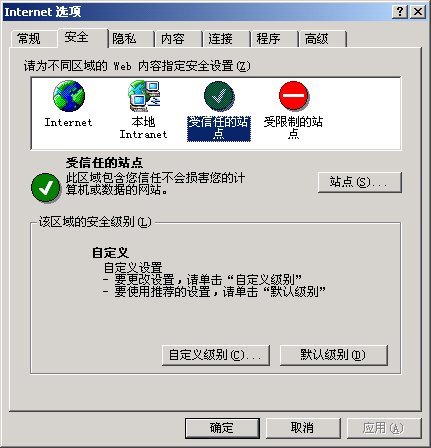2. 在 "安全 "标签中,选择 "受信任的站点 "项。然后点击 "站点 "按钮,弹出 "可信站点 "对话框。(如图 2)