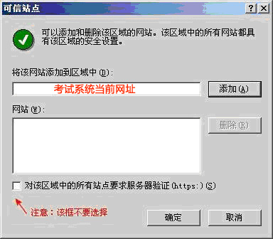 3. 在 "可信站点 "对话框中,输入本系统所在的服务器名,添加到 "网站 "栏内,最后按确定按钮。 (注意:对话框下方的复选框不要选择)