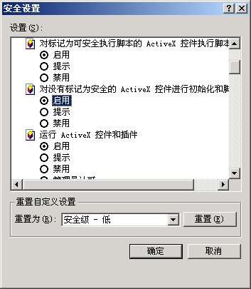 4. 回到 "安全 "标签中,点击 "自定义级别 "按钮,弹出 "安全设置 "对话框(如图 3)。在 "重置为 "选择框中,选择 "安全级 - 低 "选项,点击 "重置 "按钮。然后再将 "对没有标记为安全的 ActiveX控件进行初始化和脚本运行 "项设置为 "启用 ",最后按确定按钮。