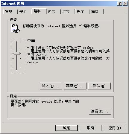5. 用户必须确保浏览器允许使用 cookie.浏览器默认是允许使用 cookie,但如果用户更改过浏览器设置致使出现无法登录的情况,请检查 "隐私 "设置,选择允许 cookie的隐私级别,一般为 "中高 "或以下均可 .步骤为:打开客户端浏览器,选择 "工具 "菜单下的 "Internet 选项 "命令 ,弹出 "Internet 选项 "对话框。并在 "Internet 选项 "对话框中,选择 "隐私 "标签,如图 4:
