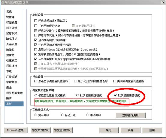 如果使用 IE 浏览器按照上述步骤设置后仍然不能够提交请下载搜狗高速浏览器,网址 http://ie.sogou.com/, 并在搜狗高速浏览器中设置兼容模式,后进入在线作业,如图 5 所示,此操作最为简单。