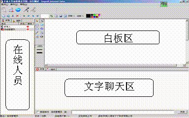 系统主要分为:白板区、在线人员显示区、文字聊天区等,另外还有菜单栏、工具栏、聊天内容输入框等。在线人员区域内,你可以看到和你同时在线的人,红衣服人像表示教师,蓝衣服人像表示学生,其中有红色边框的表示自己本人。