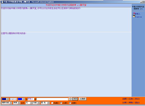 任何人都可以成为e-L聊天室的客人,但是必须互相尊重,对自己的言论和行为负责,遵守国家和中南大学网络教育聊天室的有关规定。