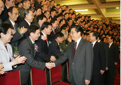 2003年9月30日,中央领导接见全国留学生回国人员先进个人和先进工作单位代表。胡锦涛和黄伯云(右一)亲切握手