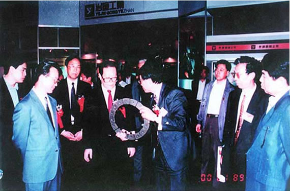 江泽民总书记参观我校高科技产品——飞机刹车片